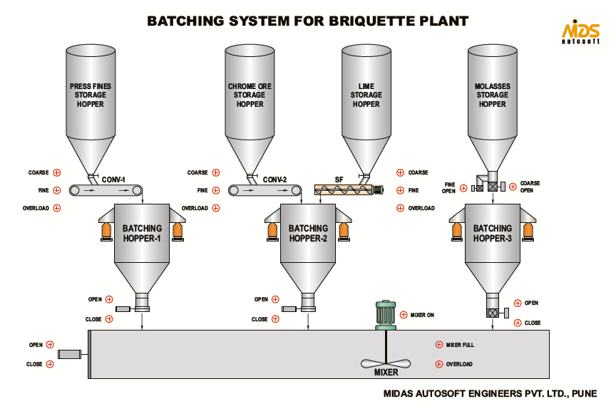 System Description: Batching hoppers are provided below storage hoppers (first Batch hopper for Chrome fines / Lime and second for Molasses). Batch hoppers are installed on imported Load cells below the storage hoppers. The Vibrofeeder/Conveyer, Screw feeder and Ball valve is provided below storage hoppers for charging the raw material into Batching hoppers. Batch hoppers will have Gate valve and Ball Valve to discharge the batched materials into the Mixer. Load cells are connected to Batch controllers, which are mounted in Batching system Panel for Weight Indication and batching operations. The Batch controllers having facility to program for individual set points and manual component, inputs such as start, stop and abort the batch, outputs for VFD of Conveyer/screw feeder and Ball/Gate valves, timer and discharge sequence. Batch house panel will have switches, lamps, timers, power supply, relays, VFD’s for conveyer/screw feeder, etc. for Automatic/Manual operation and Mimic diagram of the complete Batching system to know the status (ON/OFF, Coarse/Fine, Overload, etc.) of the field Instruments like Screw feeder, Conveyers, Gate/Ball Valves, Mixer and Mixer gate.