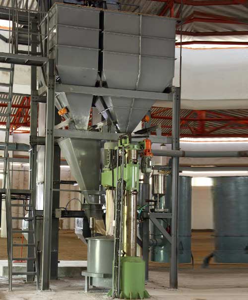 Raw material will be unloaded into the ground hoppers. Raw Material from ground hopper will be conveyed through Bucket Elevator system and discharge into storage hoppers located on top of weighing hopper. Screw feeders will be provided for Resin & Dolomite for charging preset/set point material in weighing hoppers through bin activators.